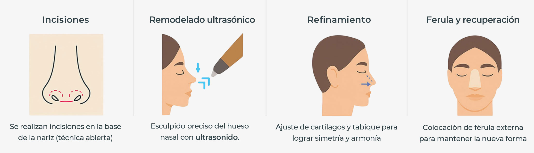 Es una rinoplastia asistida con un bisturí piezoeléctrico, que permite cortar el hueso de forma precisa, reduciendo el sangrado y la inflamación. No se usa cincel ni martillo.